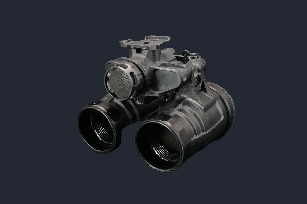 Using advanced multi-axis CNC machining an ultra lightweight and robust design is achieved, including an optimal single piece pod geometry. This binocular includes features such as individual pod stow shutoff, IPD stops, user adjustable pod tension, and low battery indicator. The device is powered on-board by a single CR123A for a continuous runtime of ~25 hours, and equipped with a LEMO port for external power pack use to achieve extensive run time.